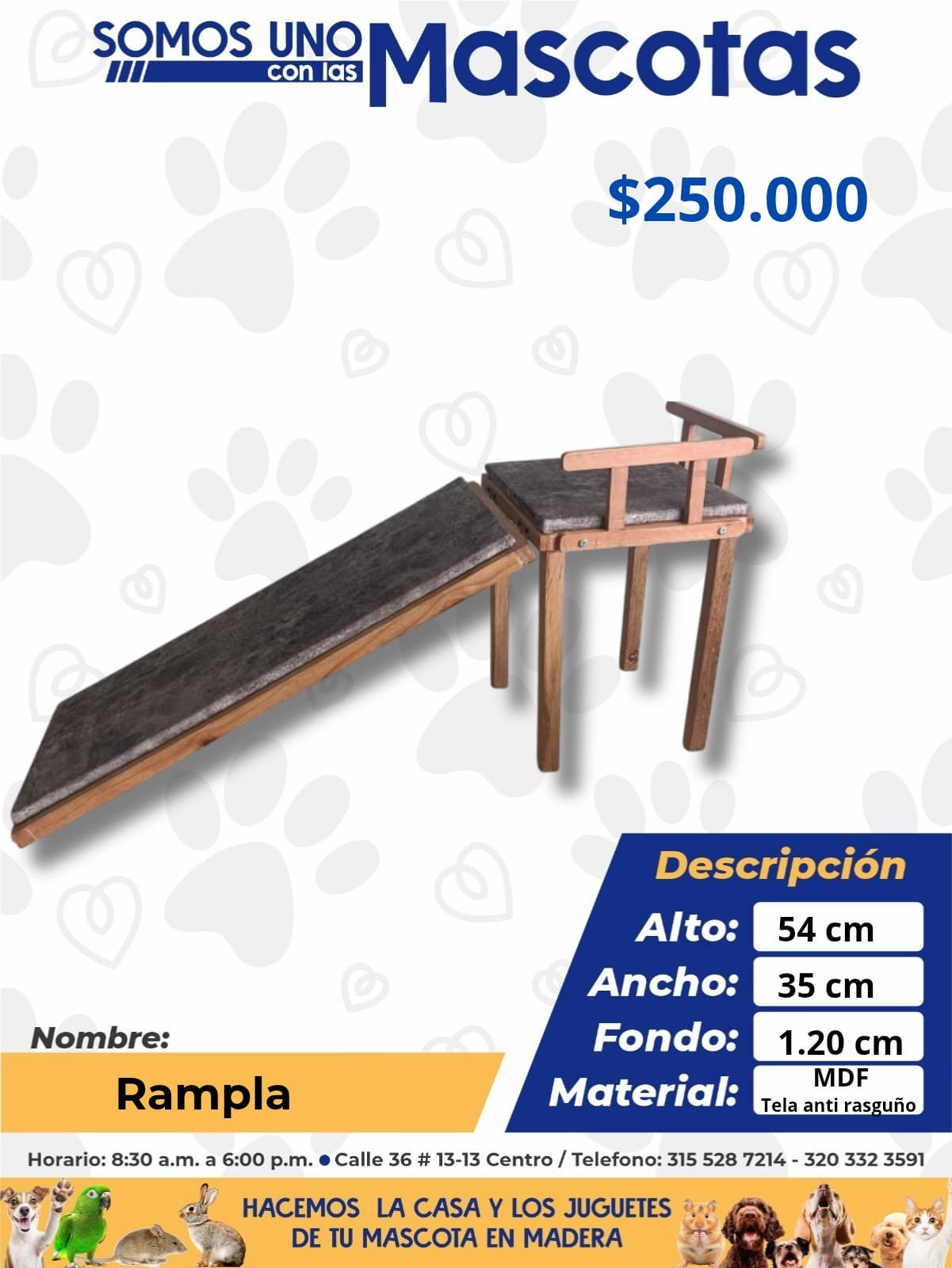 Esta Rampla es la ayuda perfecta para tu mascota. Con una robusta construcción en pino y MDF y una superficie de tela antirrasguños, es una rampa estable y segura que facilita el acceso a camas o sofás. Medidas: 54 cm (alto) x 35 cm (ancho) x 1.20 cm (fondo). Materiales: Pino, MDF y tela antirrasguños.